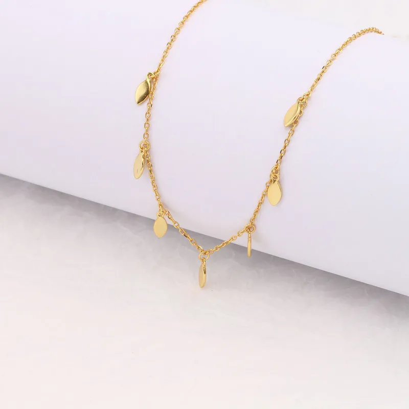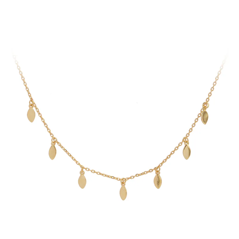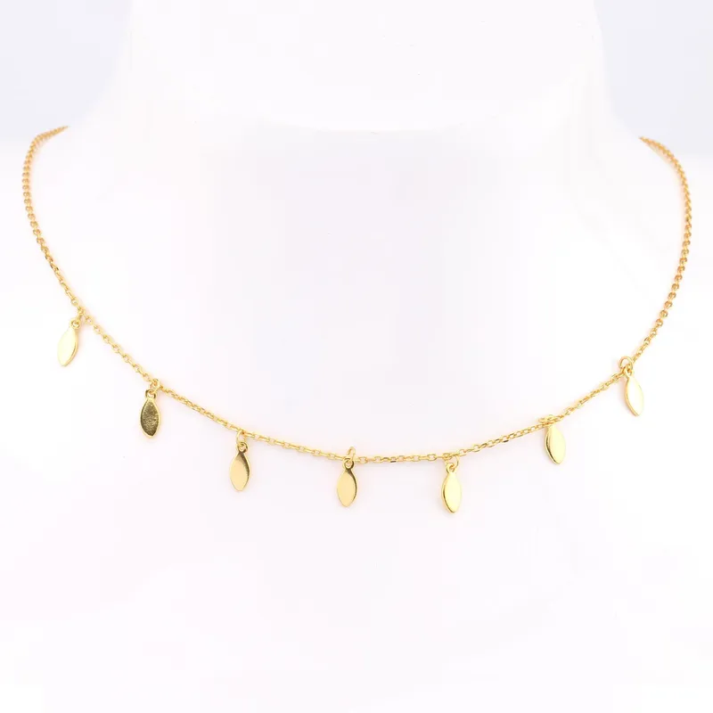 A minimalist gold choker necklace featuring tiny dangling oval discs for a chic, everyday layered look.