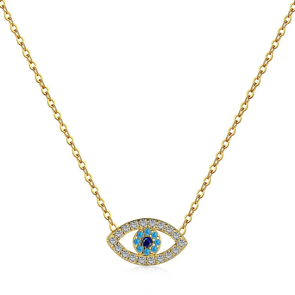 A gold necklace featuring the iconic evil eye pendant, encrusted with brilliant blue and white crystals for protection and style.