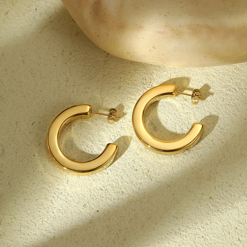 A must-have classic with a modern edge. These chunky gold hoops feature a bold silhouette and high-polish shine, making them the perfect go-to accessory for both everyday wear and elevated looks.