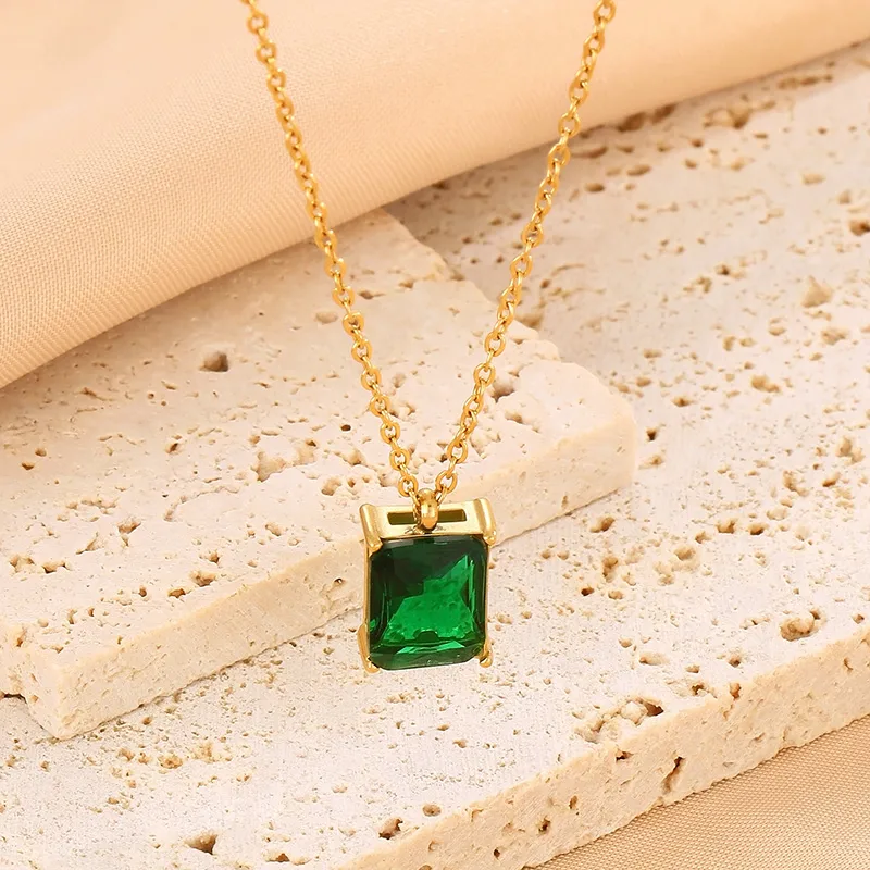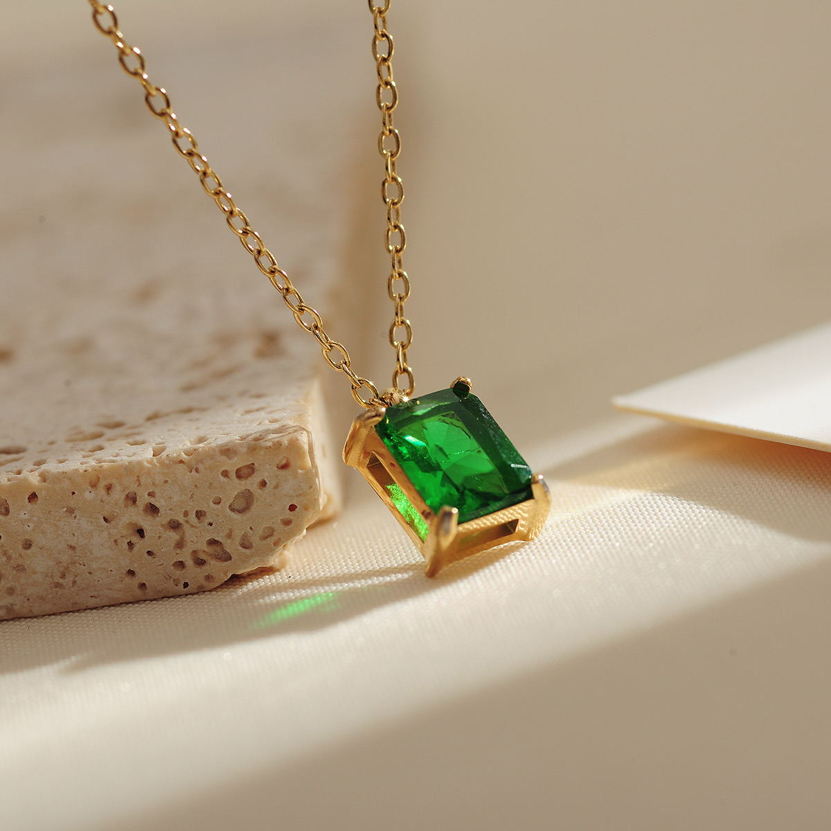 A striking emerald-green crystal pendant on a delicate gold chain, adding timeless elegance to any look.