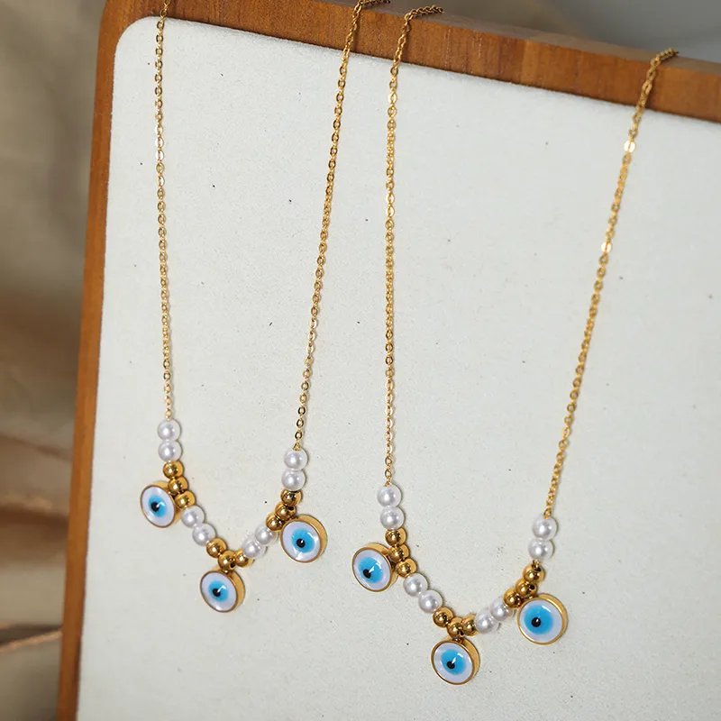 A protective charm necklace featuring classic blue evil-eye talismans with elegant pearl and gold accents.