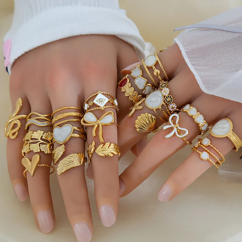 Celebrate elegance and versatility with this curated collection of gold rings from ASOCA. Inspired by the beauty of the cosmos and timeless artistry, these designs range from celestial motifs of sun, moon, and stars to romantic heart-shaped inlays and delicate double-band silhouettes adorned with luminous white stones. Vintage-inspired mother of pearl cameos and flowing wave accents add classic refinement, while bold twisted bands and contemporary chain link rings bring a modern edge. Lightweight, adjustable, and perfect for everyday wear, each piece strikes the perfect balance between simplicity and sophistication. Whether stacked for a layered look or worn solo as a statement piece, these rings offer charm, refinement, and timeless appeal for every occasion.