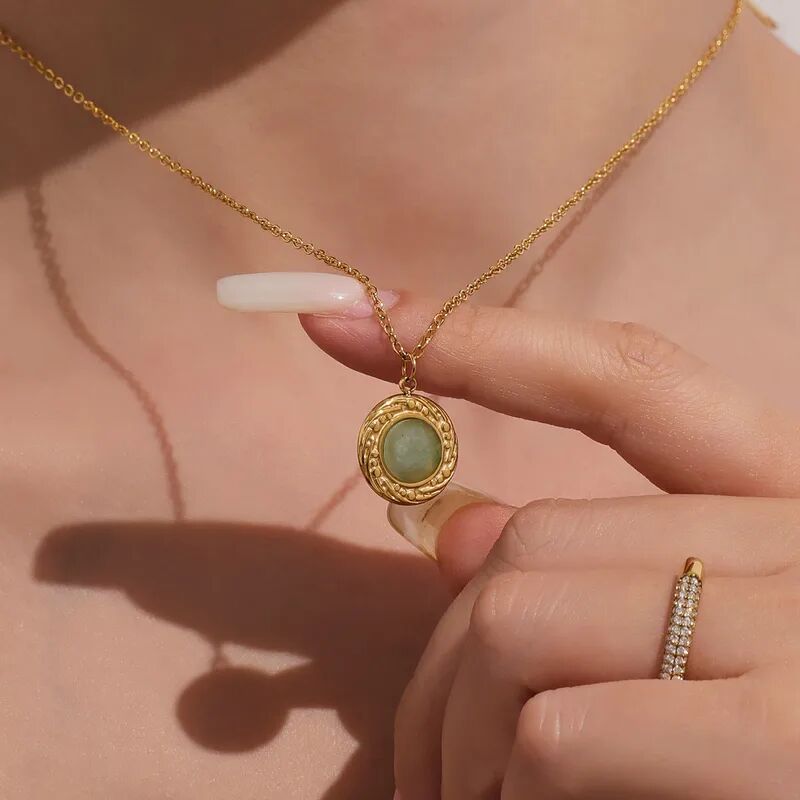 A timeless essential with a touch of natural beauty. This gold necklace features a delicate oval-shaped stone pendant, framed in polished gold for a refined and versatile look. Perfect for everyday wear or layering with other pieces.