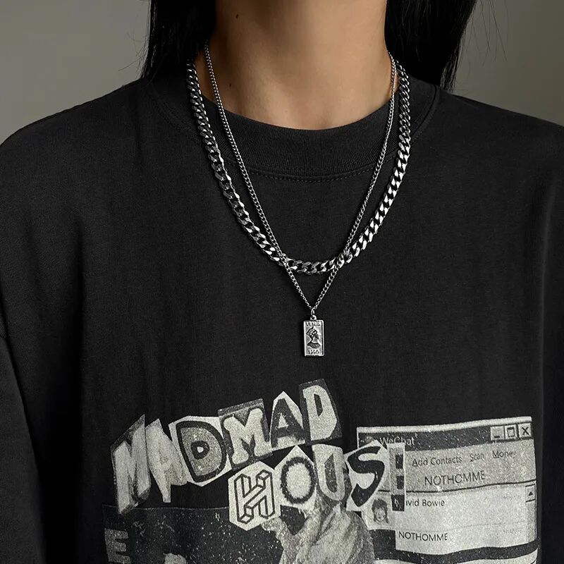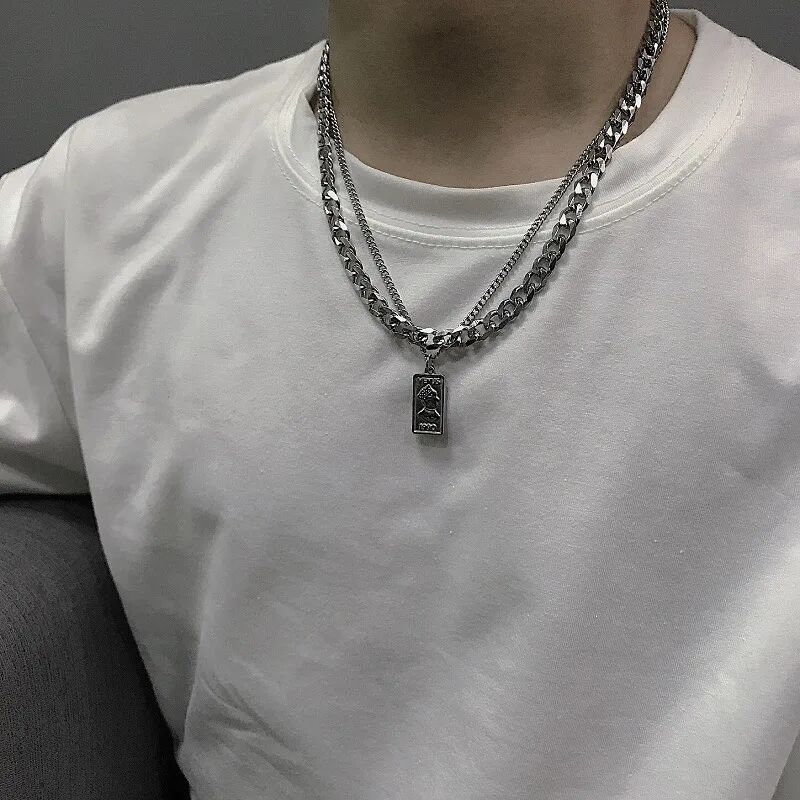 A trendy layered necklace combining a bold curb chain with a slimmer pendant chain, finished with a rectangle pendant. Perfect for urban, casual, and streetwear styles.
