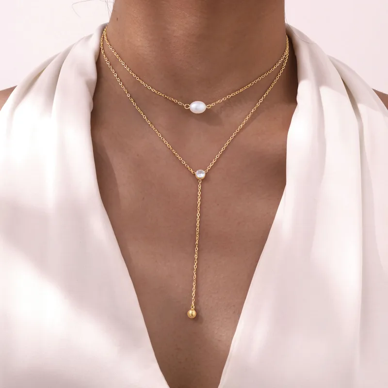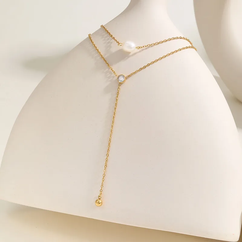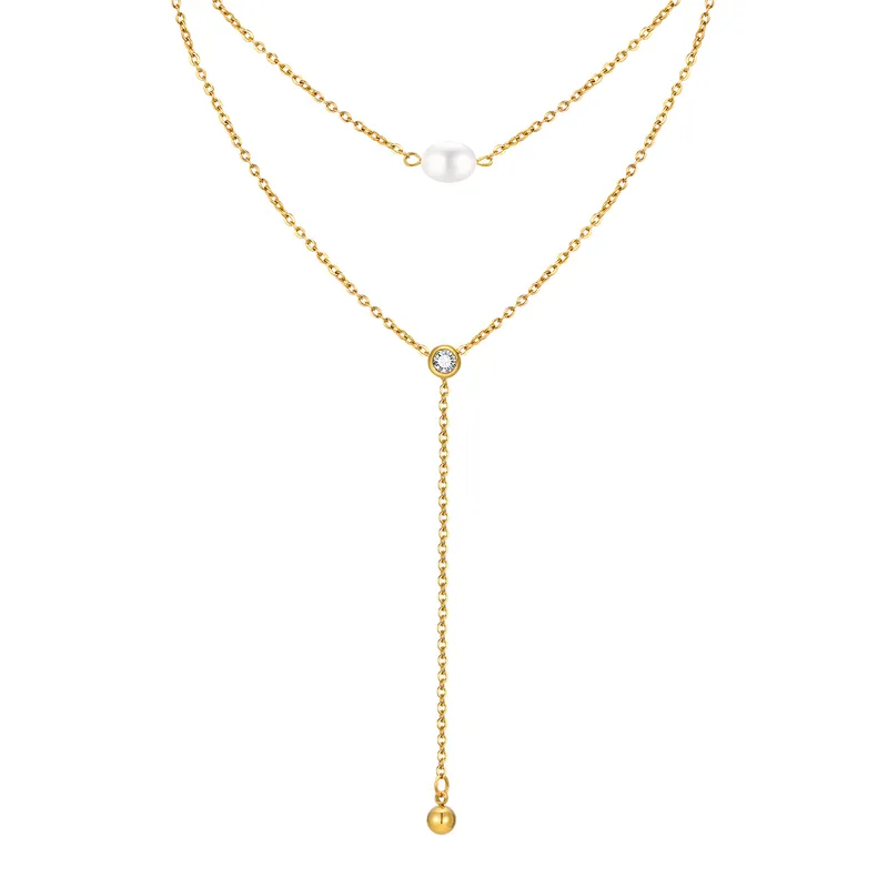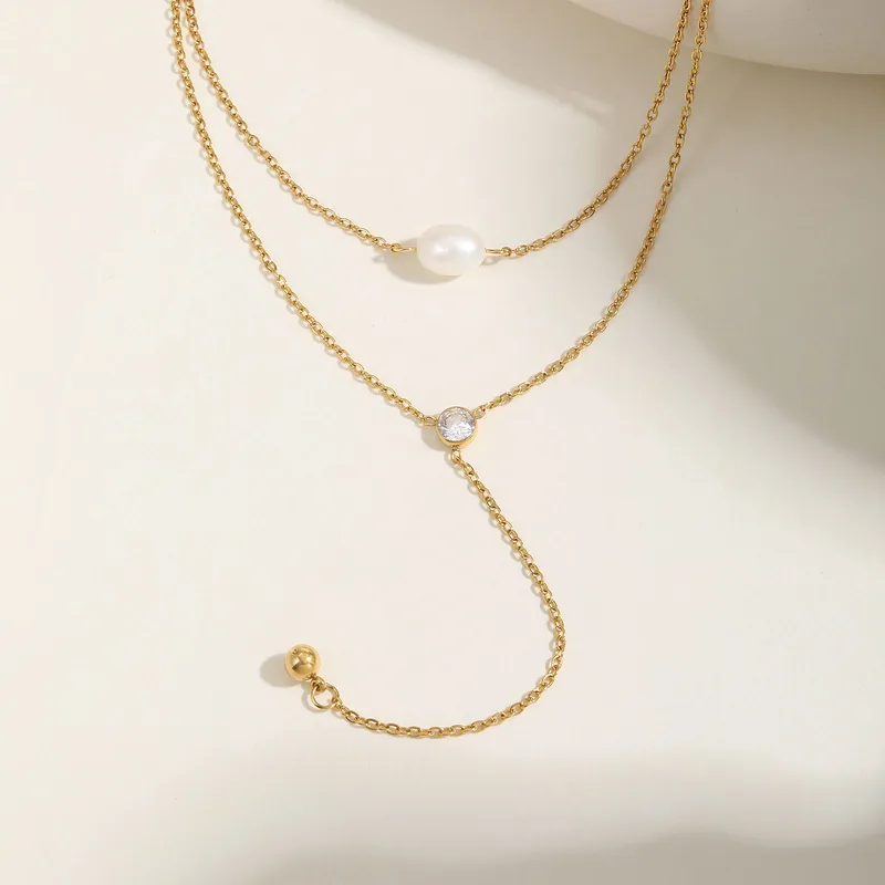 Elegant double-layer necklace featuring a luminous freshwater pearl and a sparkling crystal accent, both set on delicate 18k gold-plated chains.