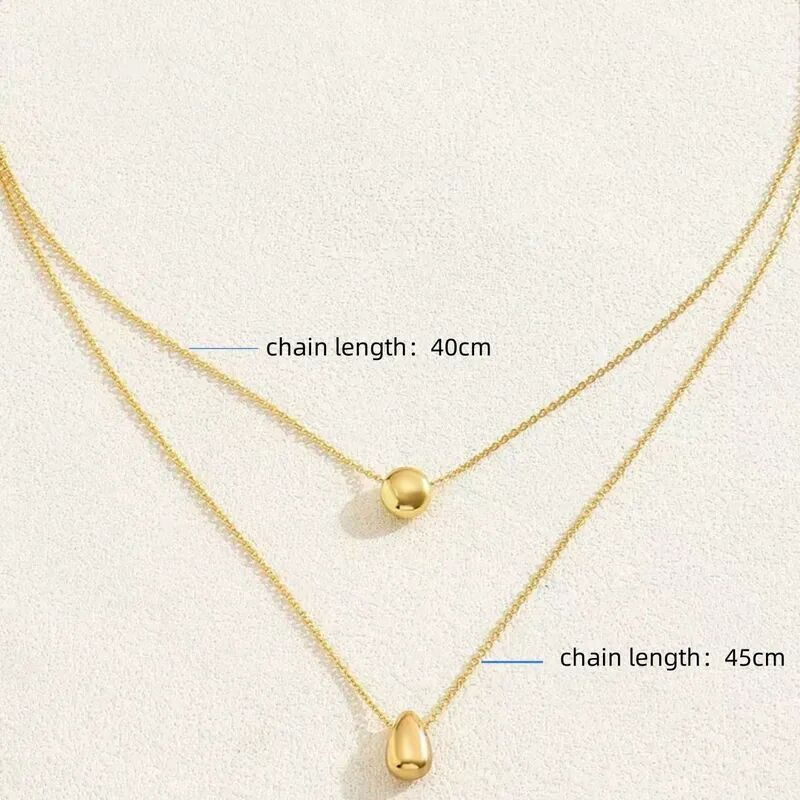 A chic layered necklace featuring two delicate gold chains, each with a polished drop-shaped pendant. Its minimalist design makes it a versatile accessory for both casual and elegant outfits.
