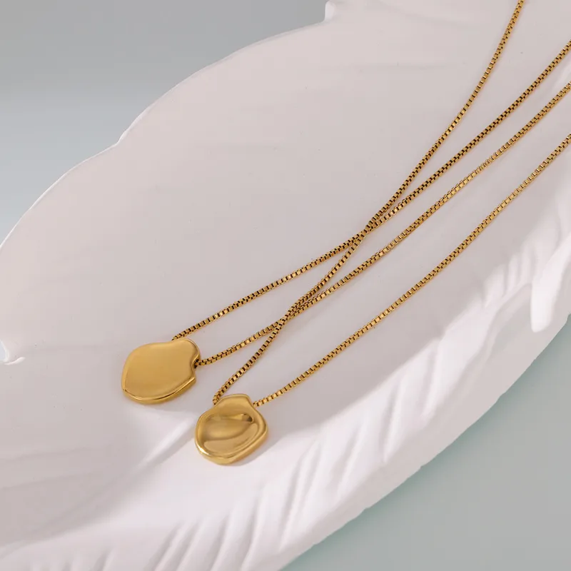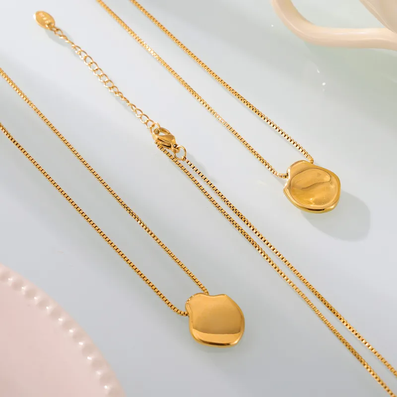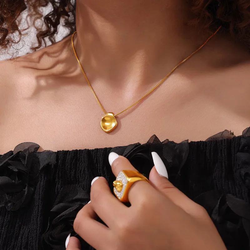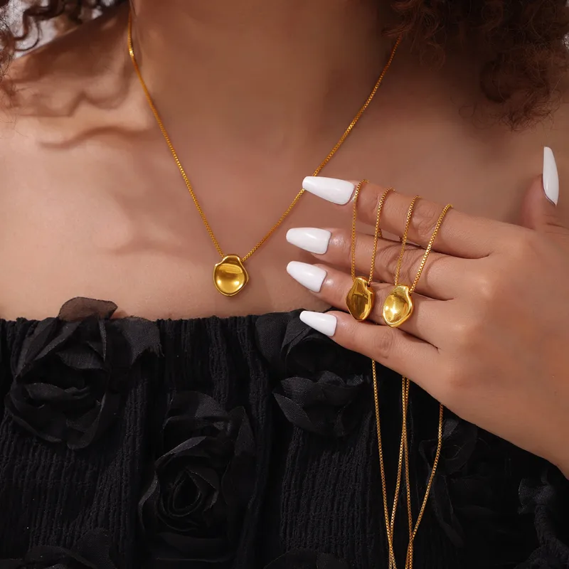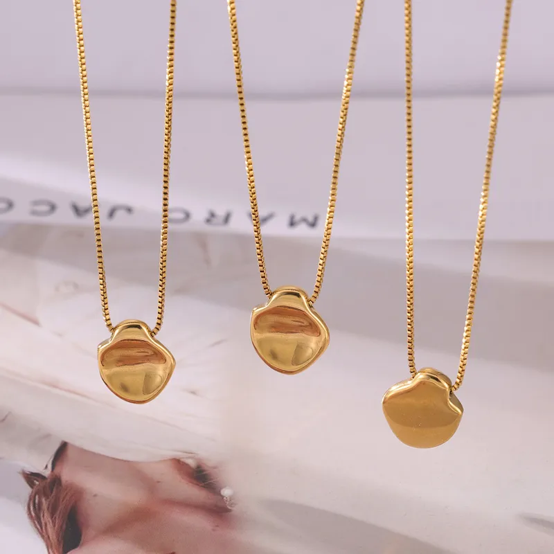 A modern minimalist necklace featuring a smooth, pebble-inspired pendant with a high-shine 18k gold finish.