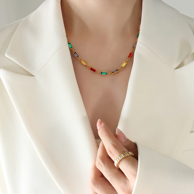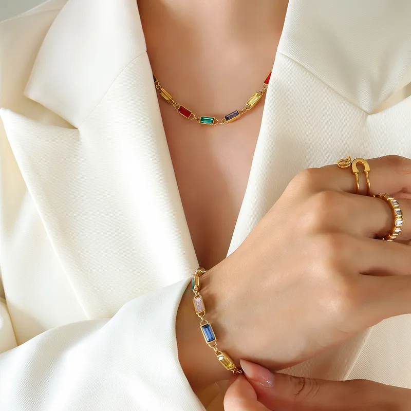 A vibrant, eye-catching jewelry set featuring a necklace and bracelet adorned with multicolored baguette-cut crystals.