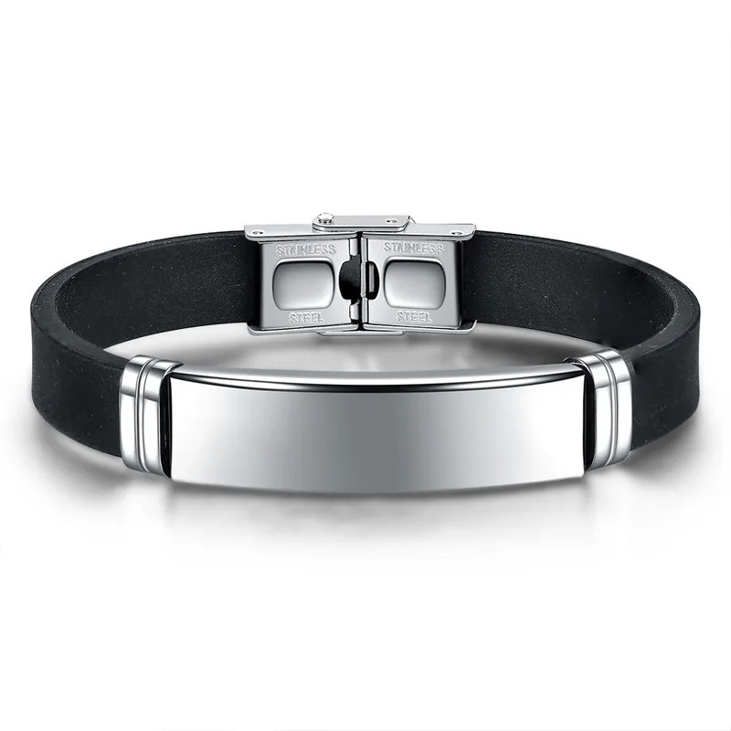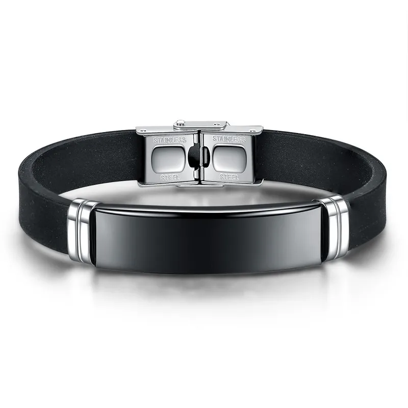 Designed for the modern man, this stainless steel and silicone ID bracelet combines durability with sleek style. The polished plate detail adds a touch of elegance, while the flexible black silicone band ensures comfort for everyday wear. Versatile enough to wear solo or stacked, it’s the perfect accessory for a bold, contemporary look.