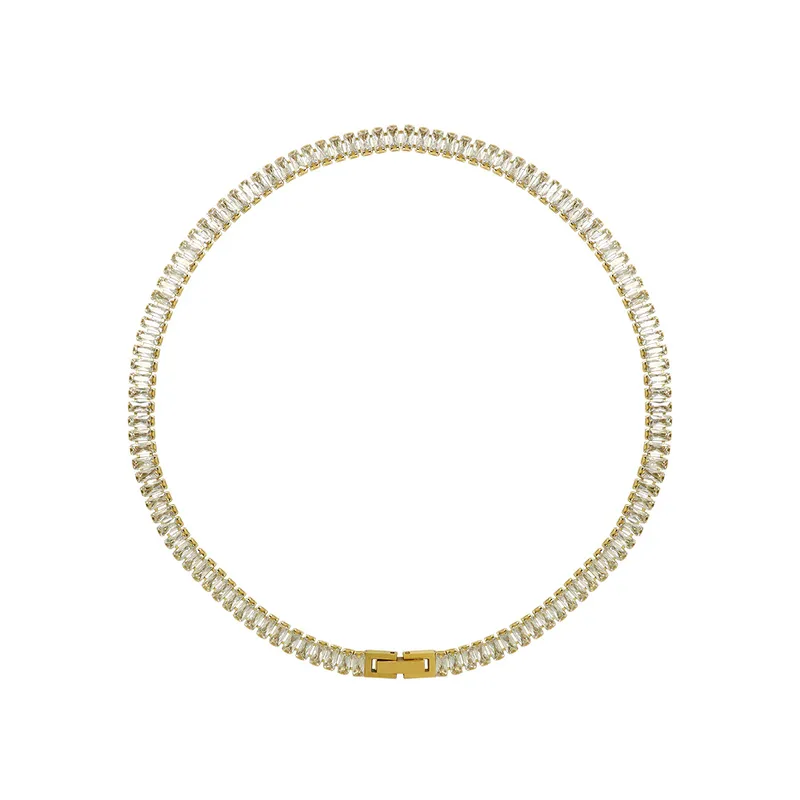 An elegant gold tennis necklace featuring a continuous row of brilliant-cut crystals, offering timeless sophistication and radiant shine.